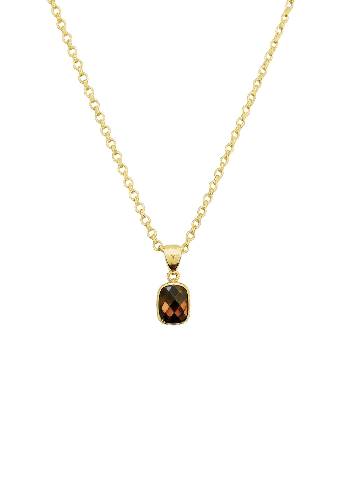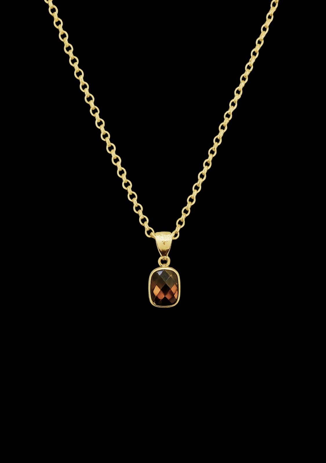 Facetli kesim kare formundaki taş, çok yüzlü kesimiyle ışığı farklı açılardan yansıtarak kendine özgü bir derinlik sunar. Altın doç zincir ise kolyeye hem sağlamlık hem de klasik bir şıklık kazandırır. Gündelik şıklık ya da özel davetler için ideal bir tercih.