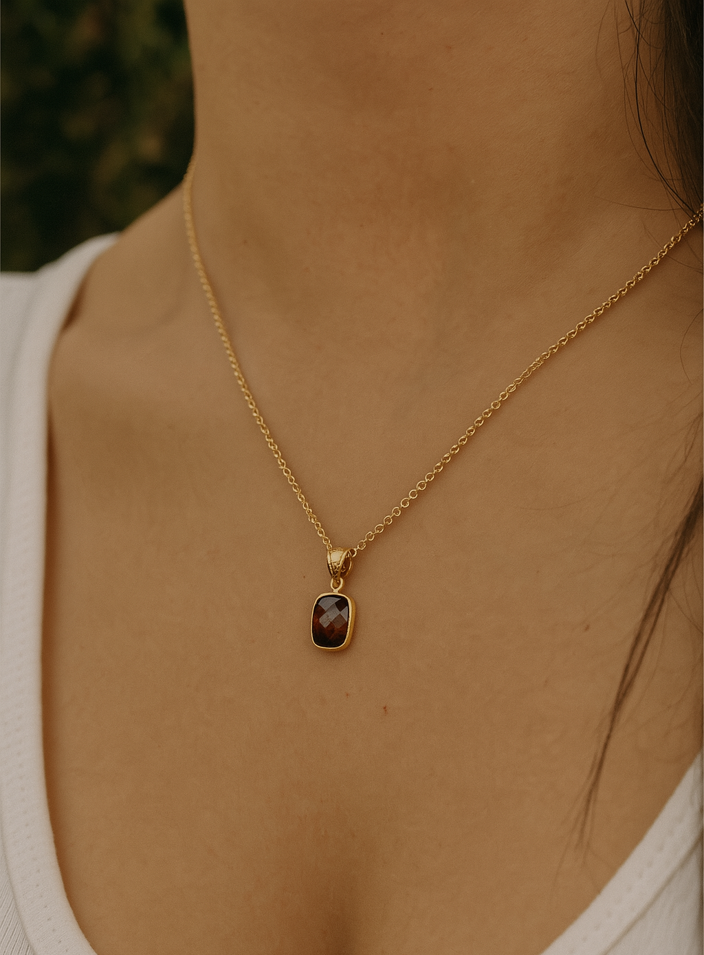 Doğallığın ve zarafetin buluştuğu bir tasarım… 14 ayar altından üretilen bu kolye, sıcak kahverengi taşın göz alıcı ışıltısı ile stilinizi öne çıkarır.