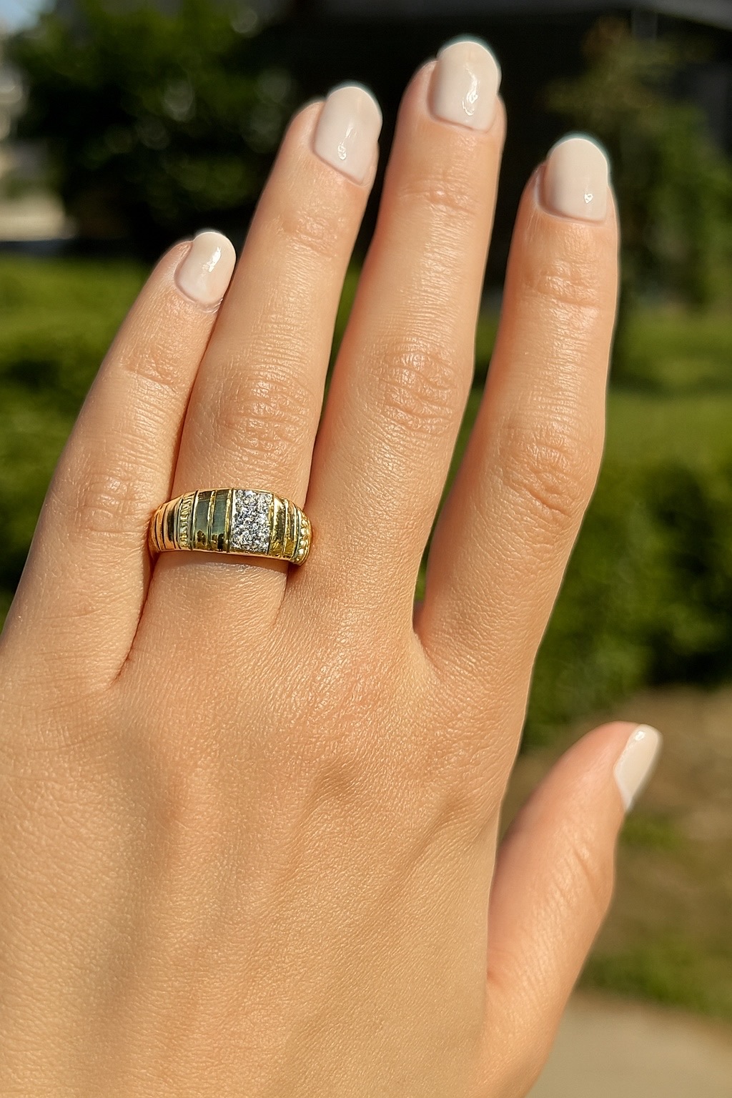 Ortadaki üç sıra taş dizilimi, zarafeti simgelerken; bombeli yüzey yapısı ve yandaki tek sıra taş dizilim detayları yüzüğe güçlü ve dikkat çekici bir hava katıyor.