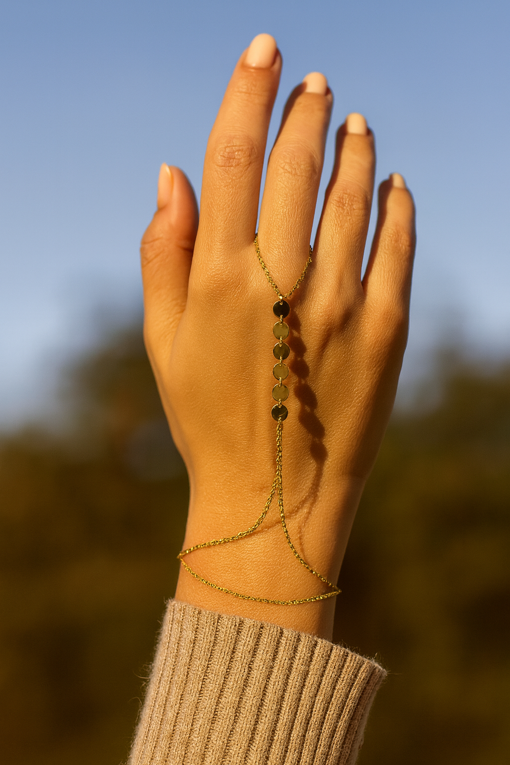 Circula Şahmeran, geleneksel şahmeran kültürünü modern bir yorumla buluşturan özel bir tasarımdır. Parmağınızdan bileğinize doğru uzanan altın zincir, yuvarlak plakalarla ışığı mükemmel şekilde yansıtır.