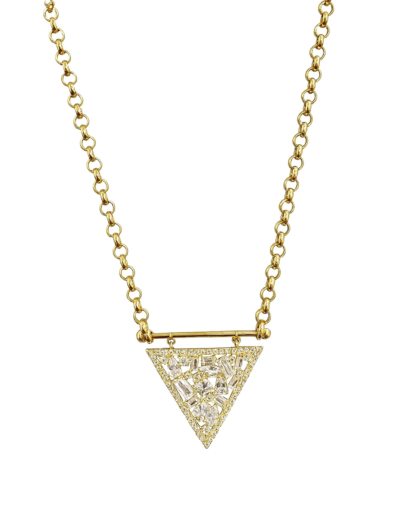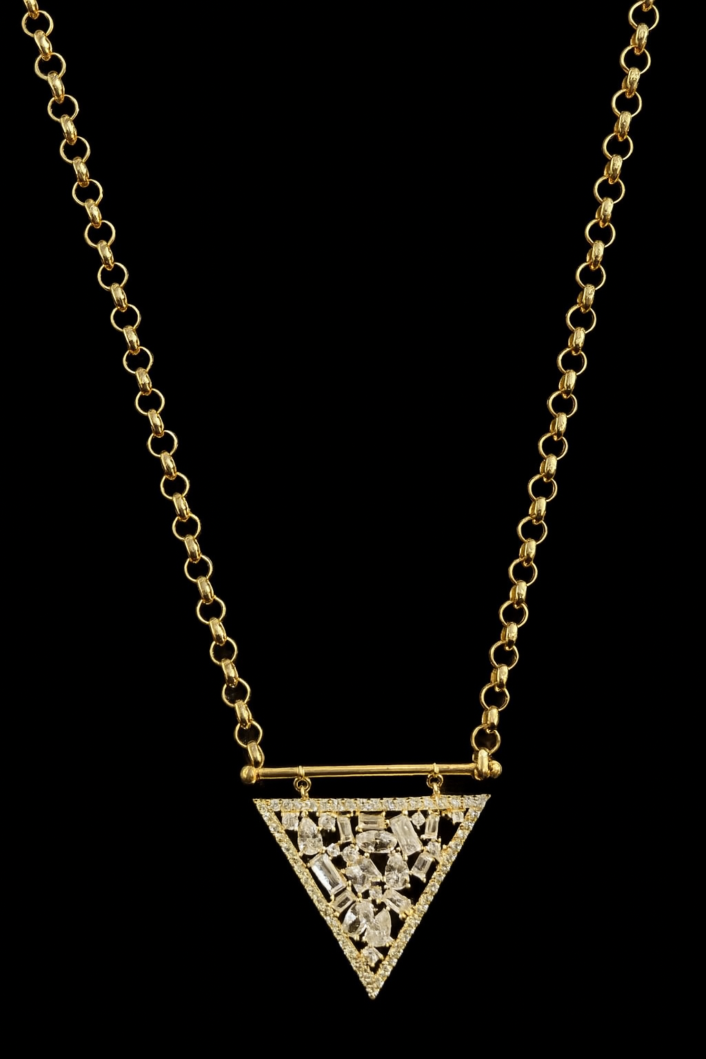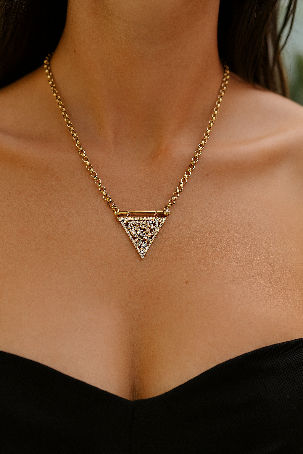 Zarafetin ve modern tasarımın mükemmel uyumu: Üçgen formda taşlarla süslenmiş bu 14 ayar altın kolye, stilinize benzersiz bir ışıltı katıyor. Yuvarlak halkalardan oluşan zinciri, sağlam ve şık yapısıyla günlük kullanıma da özel anlara da uyum sağlar. Üçgen kolye ucu ise farklı kesim taşların kombinasyonuyla göz kamaştırır.